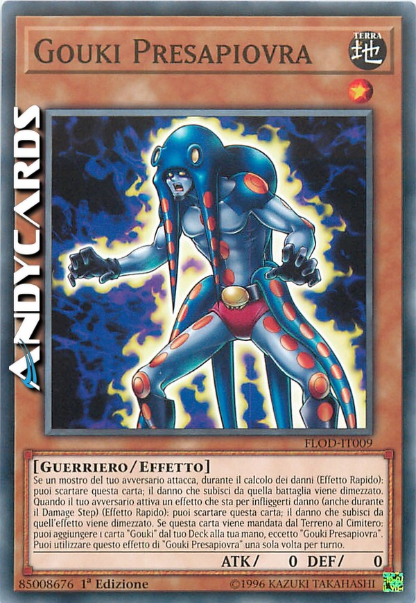 Se un mostro del tuo avversario attacca, durante il calcolo dei danni (Effetto Rapido): puoi scartare questa carta; il danno che subisci da quella battaglia viene dimezzato. Quando il tuo avversario attiva un effetto che sta per infliggerti danno (anche durante il Damage Step) (Effetto Rapido): puoi scartare questa carta; il danno che subisci da quell'effetto viene dimezzato. Se questa carta viene mandata dal Terreno al Cimitero: puoi aggiungere 1 carta "Gouki" dal tuo Deck alla tua mano, eccetto "Gouki Presapiovra". Puoi utilizzare questo effetto di "Gouki Presapiovra" una sola volta per turno.