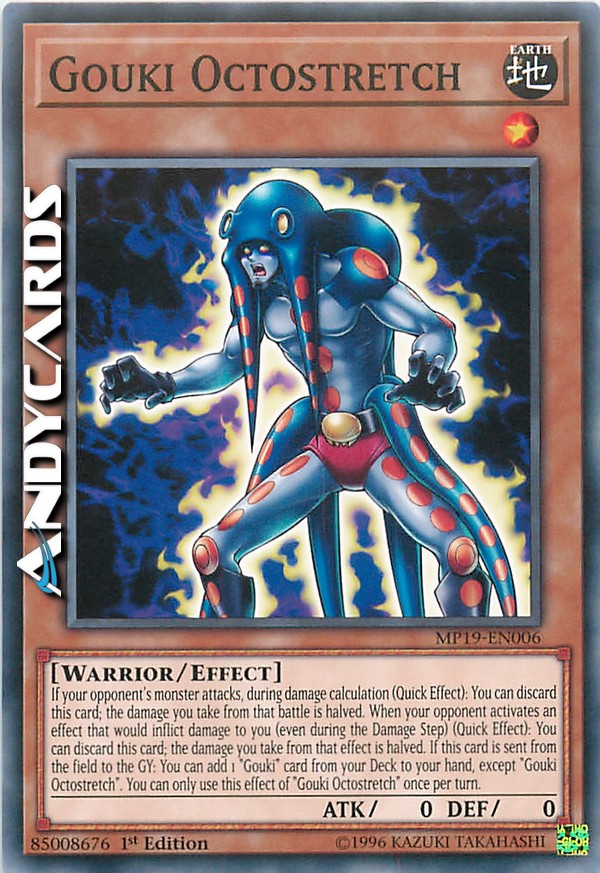If your opponent's monster attacks, during damage calculation (Quick Effect): You can discard this card; the damage you take from that battle is halved. When your opponent activates an effect that would inflict damage to you (even during the Damage Step) (Quick Effect): You can discard this card; the damage you take from that effect is halved. If this card is sent from the field to the GY: You can add 1 "Gouki" card from your Deck to your hand, except "Gouki Octostretch". You can only use this effect of "Gouki Octostretch" once per turn.