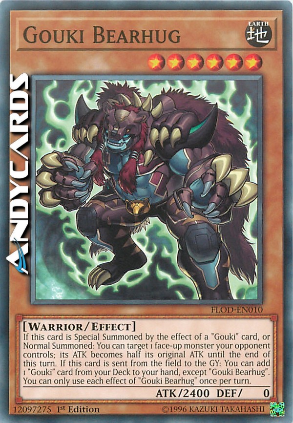 If this card is Special Summoned by the effect of a "Gouki" card, or Normal Summoned: You can target 1 face-up monster your opponent controls; its ATK becomes half its original ATK until the end of this turn. If this card is sent from the field to the GY: You can add 1 "Gouki" card from your Deck to your hand, except "Gouki Bearhug". You can only use each effect of "Gouki Bearhug" once per turn.
