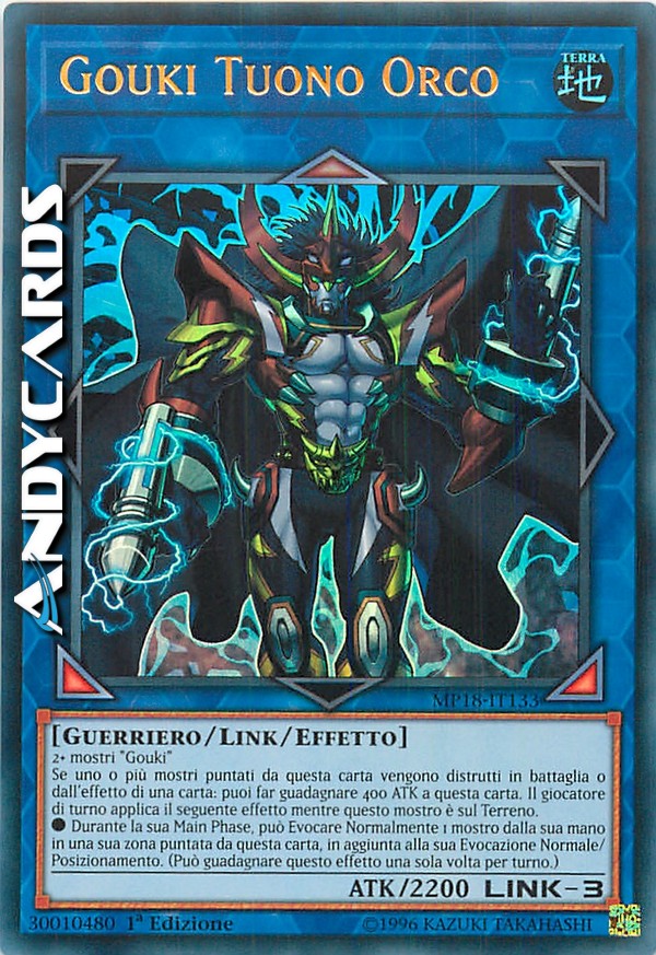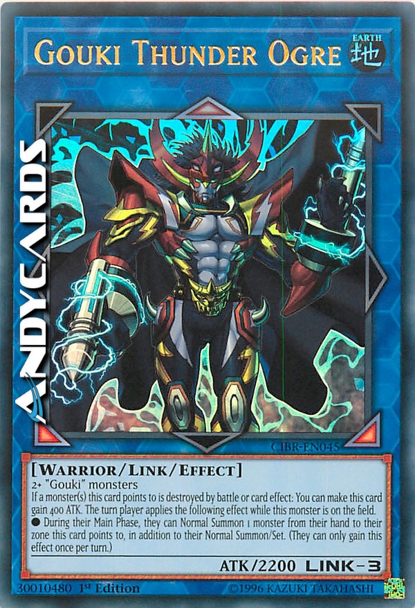 2+ mostri "Gouki" - Se uno o più mostri puntati da questa carta vengono distrutti in battaglia o dall'effetto di una carta: puoi far guadagnare 400 ATK a questa carta. Il giocatore di turno applica il seguente effetto mentre questo mostro è sul Terreno. - Durante la sua Main Phase, può Evocare Normalmente 1 mostro dalla sua mano in una sua zona puntata da questa carta, in aggiunta alla sua Evocazione Normale/Posizionamento. (Può guadagnare questo effetto una sola volta per turno.)