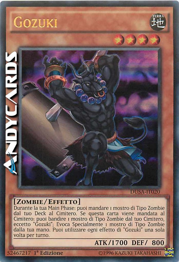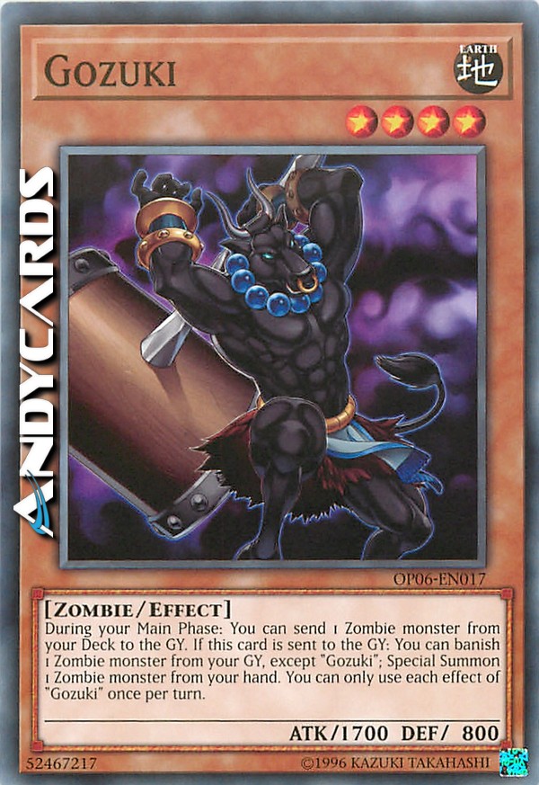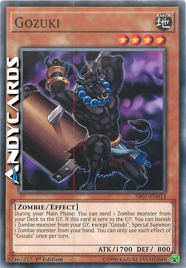 Durante la tua Main Phase: puoi mandare 1 mostro Zombie dal tuo Deck al Cimitero. Se questa carta viene mandata al Cimitero: puoi bandire 1 mostro Zombie dal tuo Cimitero, eccetto "Gozuki"; Evoca Specialmente 1 mostro Zombie dalla tua mano. Puoi utilizzare ogni effetto di "Gozuki" una sola volta per turno.