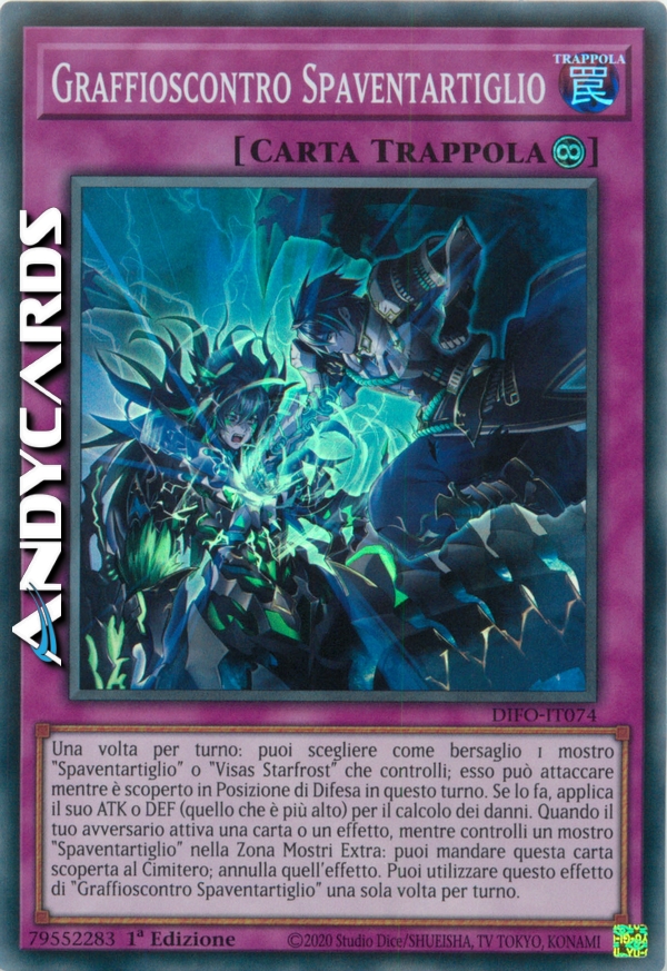 Una volta per turno: puoi scegliere come bersaglio 1 mostro "Spaventartiglio" o "Visas Starfrost" che controlli; esso può attaccare mentre è scoperto in Posizione di Difesa in questo turno. Se lo fa, applica il suo ATK o DEF (quello che è più alto) per il calcolo dei danni. Quando il tuo avversario attiva una carta o un effetto, mentre controlli un mostro "Spaventartiglio" nella Zona Mostri Extra: puoi mandare questa carta scoperta al Cimitero; annulla quell'effetto. Puoi utilizzare questo effetto di "Graffioscontro Spaventartiglio" una sola volta per turno.