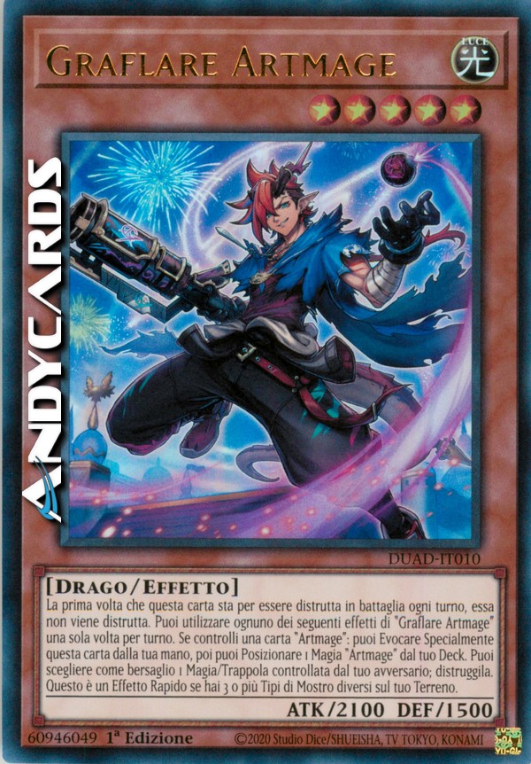 La prima volta che questa carta sta per essere distrutta in battaglia ogni turno, essa non viene distrutta. Puoi utilizzare ognuno dei seguenti effetti di "Graflare Artmage" una sola volta per turno. Se controlli una carta "Artmage": puoi Evocare Specialmente questa carta dalla tua mano, poi puoi Posizionare 1 Magia "Artmage" dal tuo Deck. Puoi scegliere come bersaglio 1 Magia/Trappola controllata dal tuo avversario; distruggila. Questo è un Effetto Rapido se hai 3 o più Tipi di Mostro diversi sul tuo Terreno.