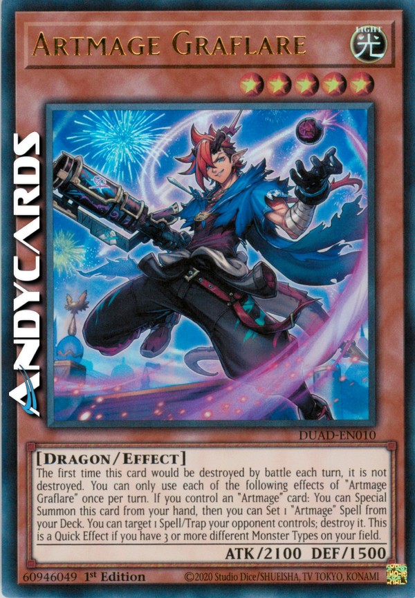 The first time this card would be destroyed by battle each turn, it is not destroyed. You can only use each of the following effects of "Artmage Graflare" once per turn. If you control an "Artmage" card: You can Special Summon this card from your hand, then you can Set 1 "Artmage" Spell from your Deck. You can target 1 Spell/Trap your opponent controls; destroy it. This is a Quick Effect if you have 3 or more different Monster Types on your field.