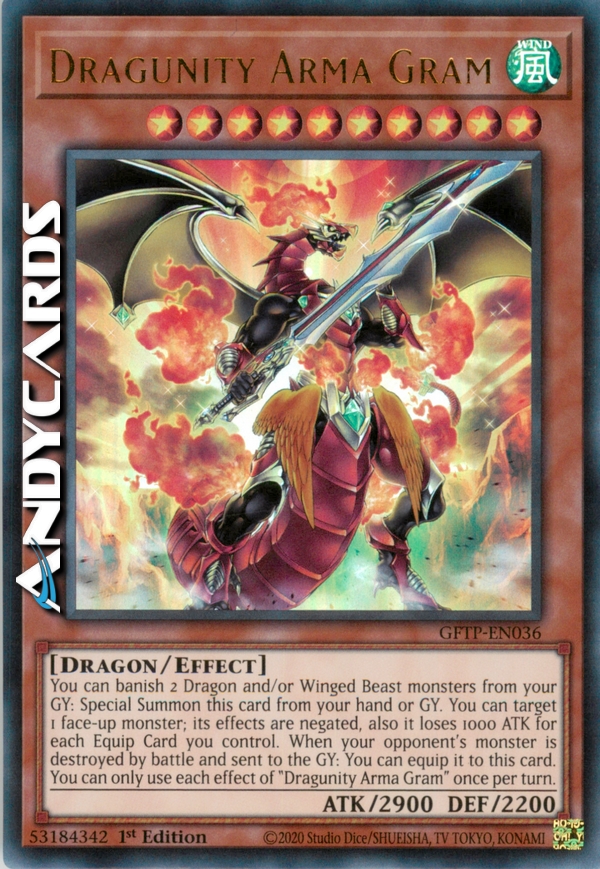 Puoi bandire 2 mostri Drago e/o Bestia Alata dal tuo Cimitero: Evoca Specialmente questa carta dalla tua mano o Cimitero. Puoi scegliere come bersaglio 1 mostro scoperto; i suoi effetti sono annullati, inoltre esso perde 1000 ATK per ogni Carta Equipaggiamento che controlli. Quando un mostro del tuo avversario viene distrutto in battaglia e mandato al Cimitero: puoi equipaggiarlo a questa carta. Puoi utilizzare ogni effetto di "Gram Arma Dragunità" una sola volta per turno.
