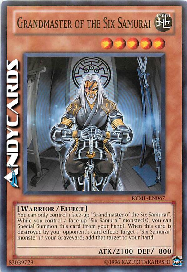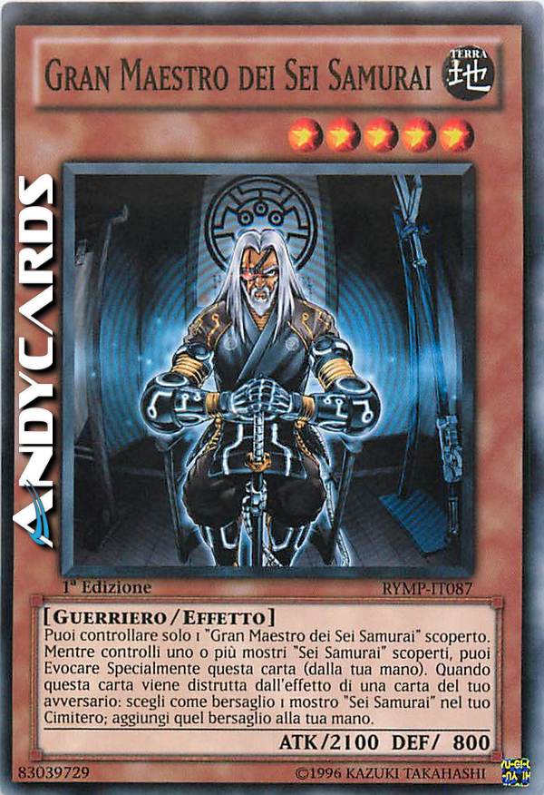 Puoi controllare solo 1 "Gran Maestro dei Sei Samurai". Se controlli un mostro "Sei Samurai", puoi Evocare Specialmente questa carta (dalla tua mano). Se questa carta sotto il tuo comando viene distrutta dall'effetto di una carta dell'avversario: scegli come bersaglio 1 mostro "Sei Samurai" nel tuo Cimitero; aggiungi quel bersaglio alla tua mano.