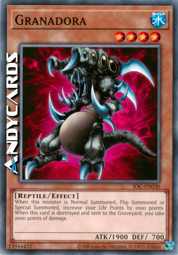 Quando questo mostro viene Evocato tramite Evocazione Normale, Evocazione per Scoperta o Evocazione Speciale, aumenta i tuoi Life Points di 1000 punti. Quando questa carta viene distrutta e mandata al Cimitero, ricevi 2000 punti di danno.