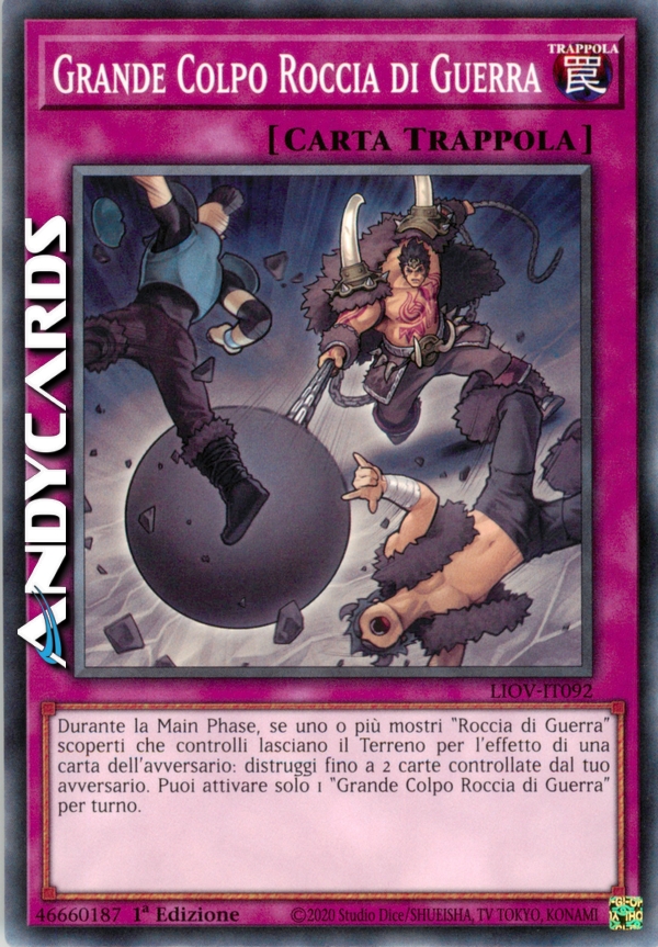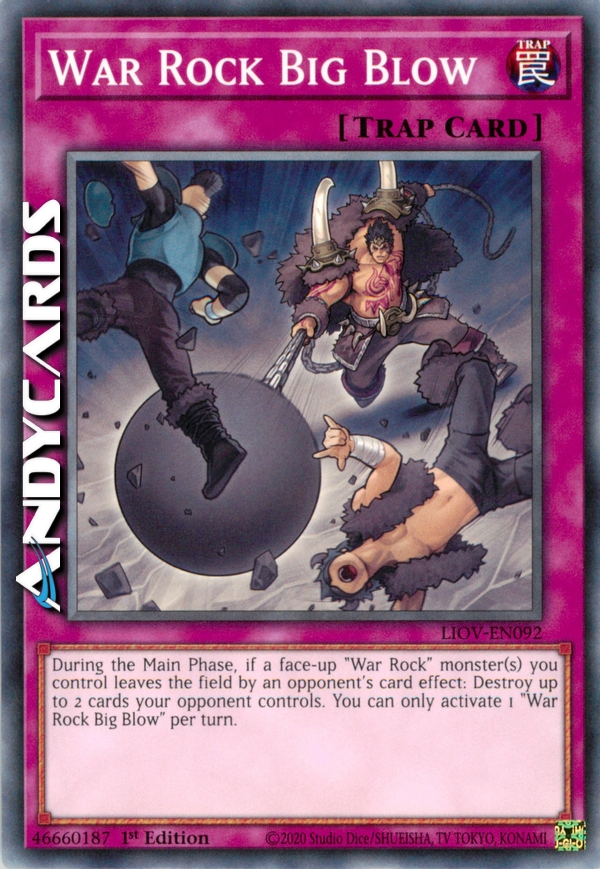 During the Main Phase, if a face-up "War Rock" monster(s) you control leaves the field by an opponent's card effect: Destroy up to 2 cards your opponent controls. You can only activate 1 "War Rock Big Blow" per turn.