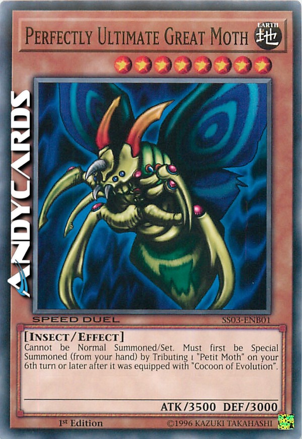 This card cannot be Normal Summoned or Set. This monster can only be Special Summoned by Tributing "Petit Moth" on the 6th of your turns after "Petit Moth" has been equipped with "Cocoon of Evolution".
