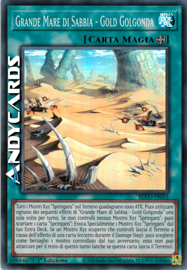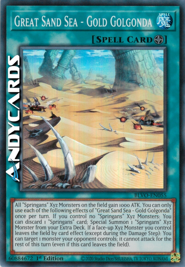 Tutti i Mostri Xyz "Springans" sul Terreno guadagnano 1000 ATK. Puoi utilizzare ognuno dei seguenti effetti di "Grande Mare di Sabbia - Gold Golgonda" una sola volta per turno. Se non controlli nessun Mostro Xyz "Springans": puoi scartare 1 carta "Springans"; Evoca Specialmente 1 Mostro Xyz "Springans" dal tuo Extra Deck. Se un Mostro Xyz scoperto che controlli lascia il Terreno a causa dell'effetto di una carta (eccetto durante il Damage Step): puoi scegliere come bersaglio 1 mostro controllato dal tuo avversario; esso non può attaccare per il resto di questo turno (anche se questa carta lascia il Terreno).