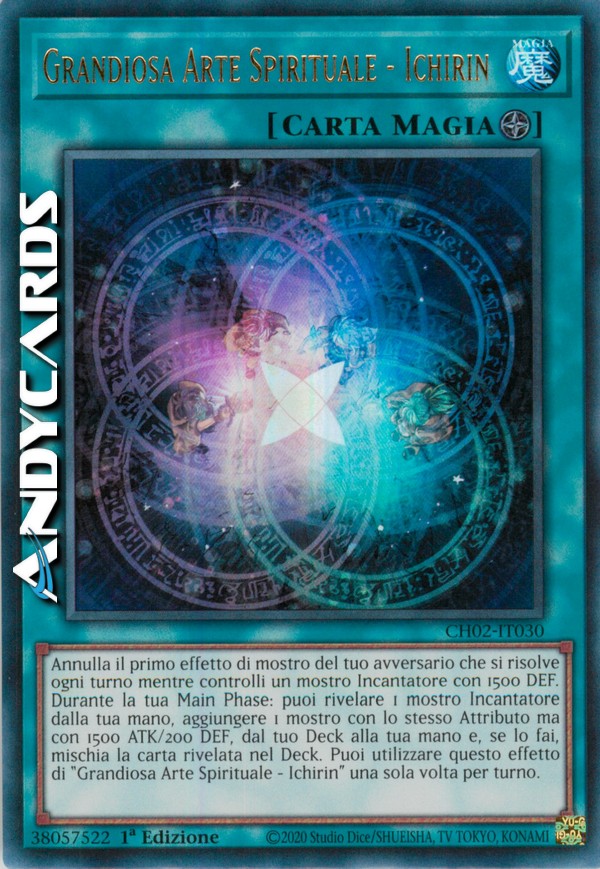 Annulla il primo effetto di mostro del tuo avversario che si risolve ogni turno mentre controlli un mostro Incantatore con 1500 DEF. Durante la tua Main Phase: puoi rivelare 1 mostro Incantatore dalla tua mano, aggiungere 1 mostro con lo stesso Attributo ma con 1500 ATK/200 DEF, dal tuo Deck alla tua mano e, se lo fai, mischia la carta rivelata nel Deck. Puoi utilizzare questo effetto di "Grandiosa Arte Spirituale - Ichirin" una sola volta per turno.