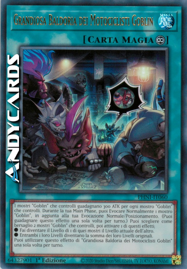 I mostri "Goblin" che controlli guadagnano 300 ATK per ogni mostro "Goblin" che controlli. Durante la tua Main Phase, puoi Evocare Normalmente 1 mostro "Goblin", in aggiunta alla tua Evocazione Normale/Posizionamento. (Puoi guadagnare questo effetto una sola volta per turno.) Puoi scegliere come bersaglio 2 mostri "Goblin" che controlli, poi attivare 1 di questi effetti;