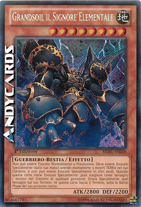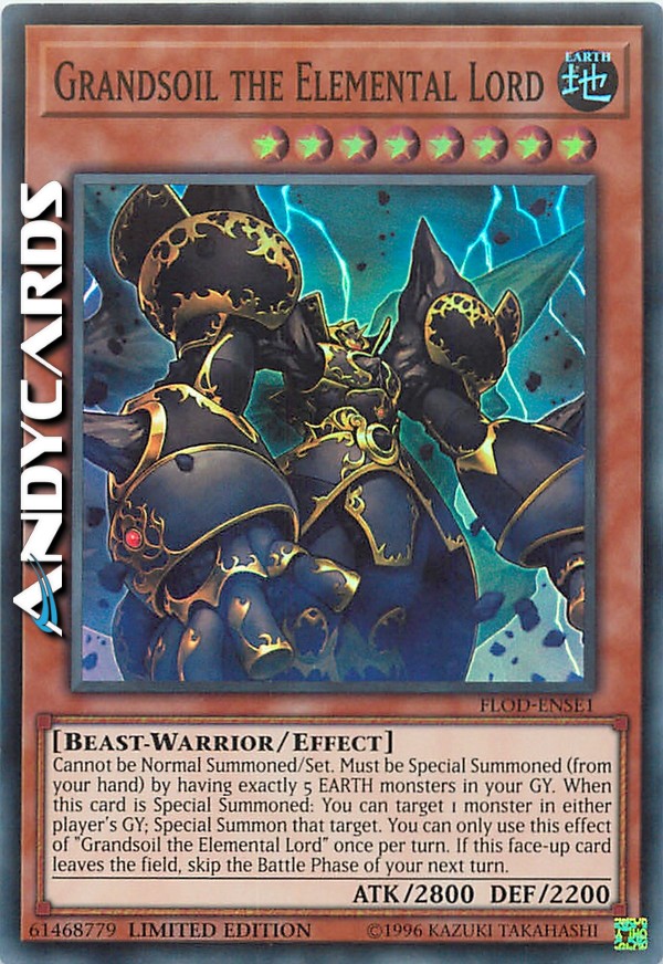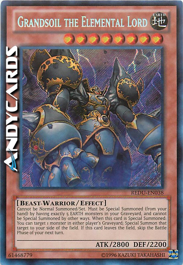 Non può essere Evocato Normalmente o Posizionato. Deve essere Evocato Specialmente (dalla tua mano) avendo esattamente 5 mostri TERRA nel tuo Cimitero, e non può essere Evocato Specialmente in altri modi. Quando questa carta viene Evocata Specialmente: puoi scegliere come bersaglio 1 mostro nel Cimitero di qualsiasi giocatore; Evoca Specialmente quel bersaglio sul tuo Terreno. Se questa carta lascia il Terreno, salta la Battle Phase del tuo prossimo turno.