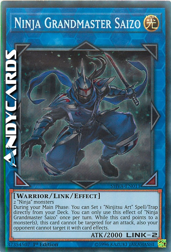 Durante la tua Main Phase: puoi Posizionare 1 Magia/Trappola "Ninjitsu" direttamente dal tuo Deck. Puoi utilizzare questo effetto di "Granmaestro Ninja Saizo" una sola volta per turno. Mentre questa carta punta uno o più mostri, questa carta non può essere scelta come bersaglio per un attacco, inoltre il tuo avversario non può sceglierla come bersaglio con gli effetti delle carte.
