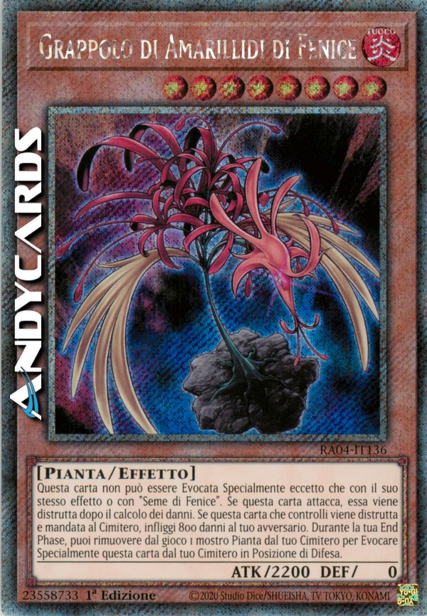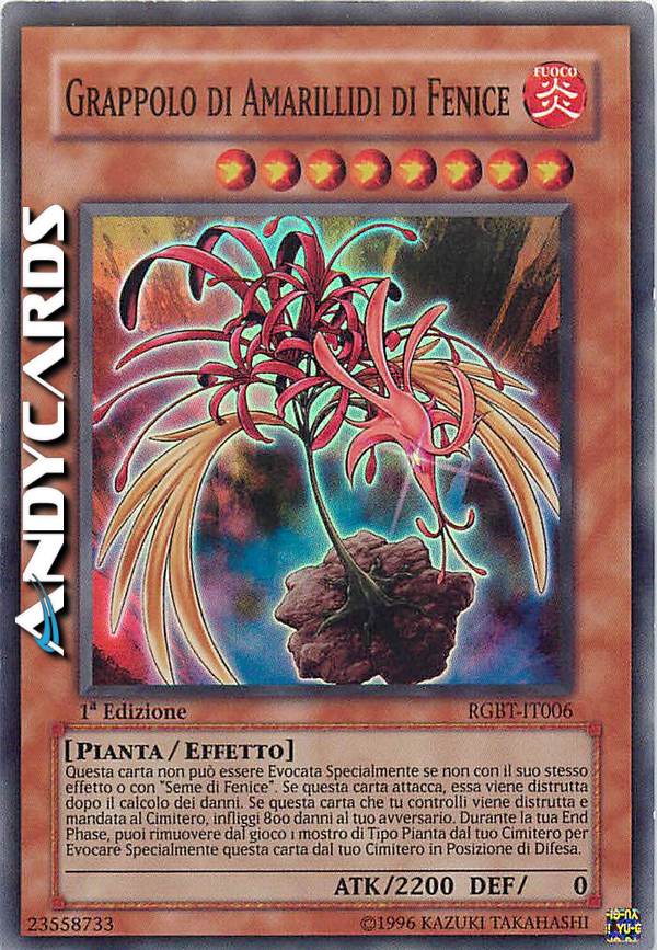 Questa carta non può essere Evocata Specialmente se non con il suo stesso effetto o con "Seme di Fenice". Se questa carta attacca, essa viene distrutta dopo il calcolo dei danni. Se questa carta che tu controlli viene distrutta e mandata al Cimitero, infliggi 800 danni al tuo avversario. Durante la tua End Phase, puoi rimuovere dal gioco 1 mostro di Tipo Pianta dal tuo Cimitero per Evocare Specialmente questa carta dal tuo Cimitero in Posizione di Difesa.