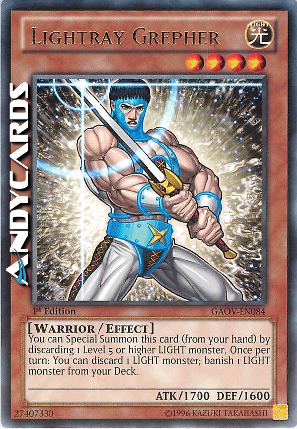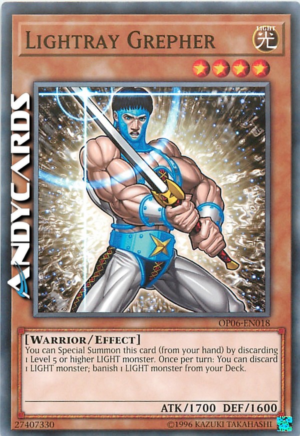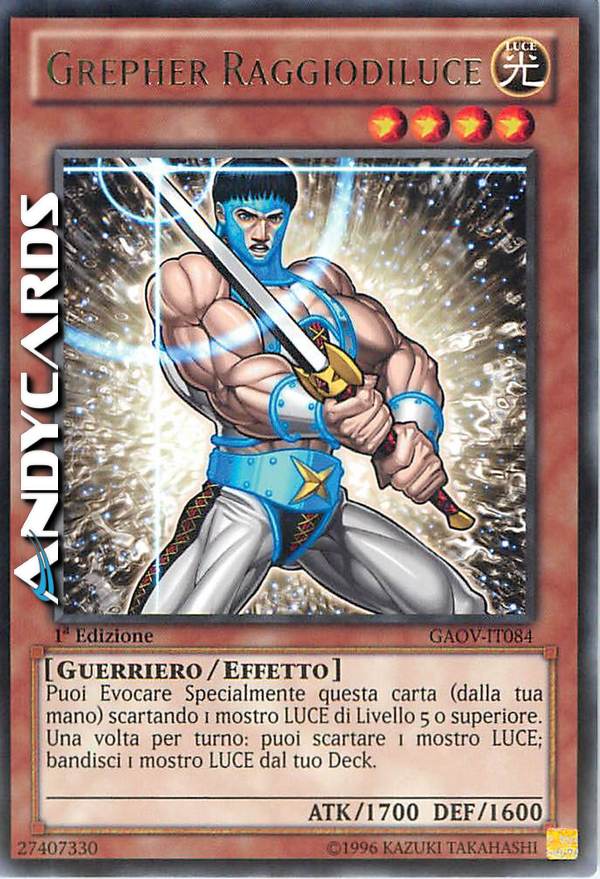 Puoi Evocare Specialmente questa carta (dalla tua mano) scartando 1 mostro LUCE di Livello 5 o superiore. Una volta per turno: puoi scartare 1 mostro LUCE; bandisci 1 mostro LUCE dal tuo Deck.