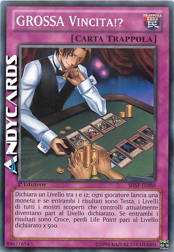 Dichiara un Livello tra 1 e 12; ogni giocatore lancia una moneta e se entrambi i risultati sono Testa, i Livelli di tutti i mostro scoperti che controlli attualmente diventano pari al Livello dichiarato. Se entrambi i risultati sono Croce, perdi Life Point pari al Livello dichiarato x 500.