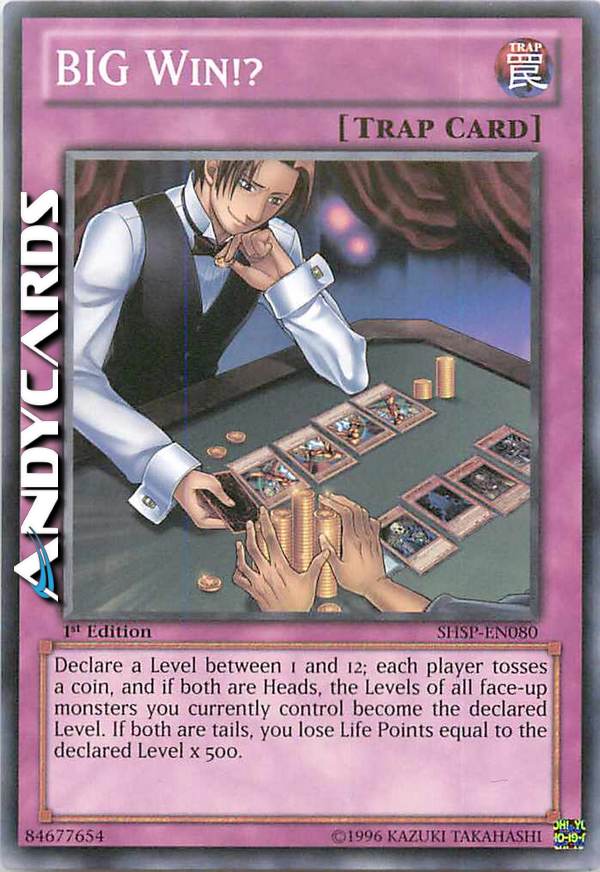 Declare a Level between 1 and 12; each player tosses a coin, and if both are Heads, the Levels of all face-up monsters you currently control become the declared Level. If both are tails, you lose Life Points equal to the declared Level x 500.
