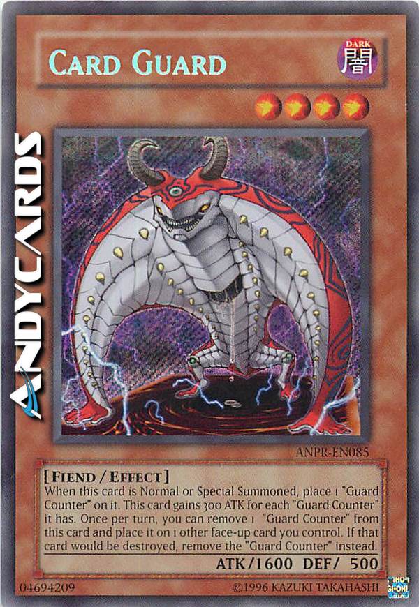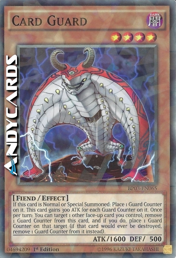 If this card is Normal or Special Summoned: Place 1 Guard Counter on it. This card gains 300 ATK for each Guard Counter on it. Once per turn: You can target 1 other face-up card you control; remove 1 Guard Counter from this card, and if you do, place 1 Guard Counter on that target (if that card would ever be destroyed, remove 1 Guard Counter from it instead).