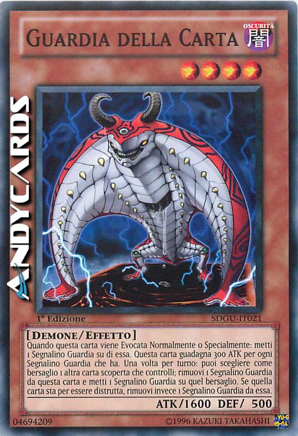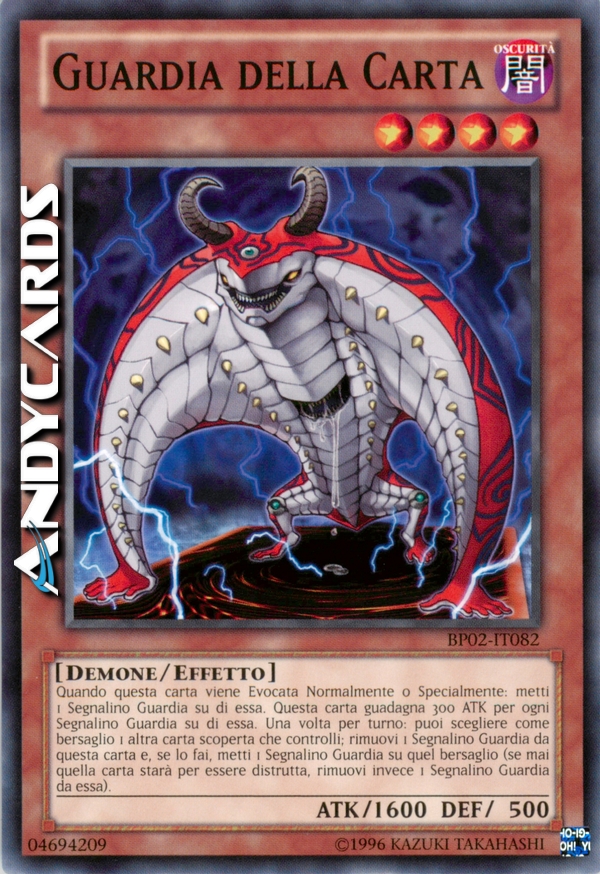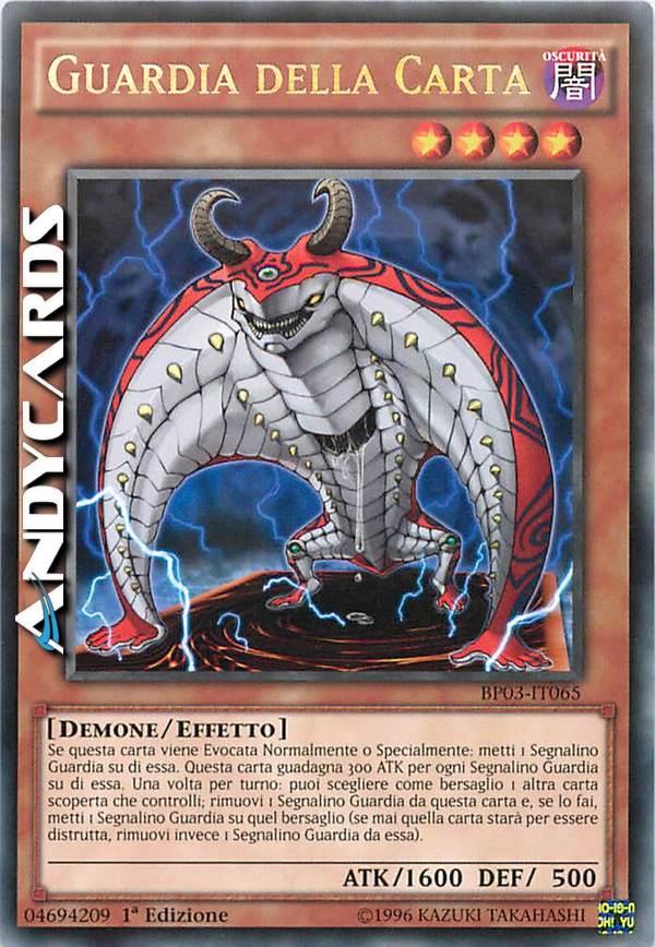 Quando questa carta viene Evocata Normalmente o Specialmente: metti 1 Segnalino Guardia su di essa. Questa carta guadagna 300 ATK per ogni Segnalino Guardia su di essa. Una volta per turno: puoi scegliere come bersaglio 1 altra carta scoperta che controlli; rimuovi 1 Segnalino Guardia da questa carta e, se lo fai, metti 1 Segnalino Guardia su quel bersaglio (se mai quella carta starà per essere distrutta, rimuovi invece 1 Segnalino Guardia da essa).