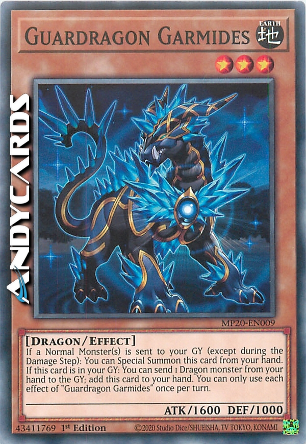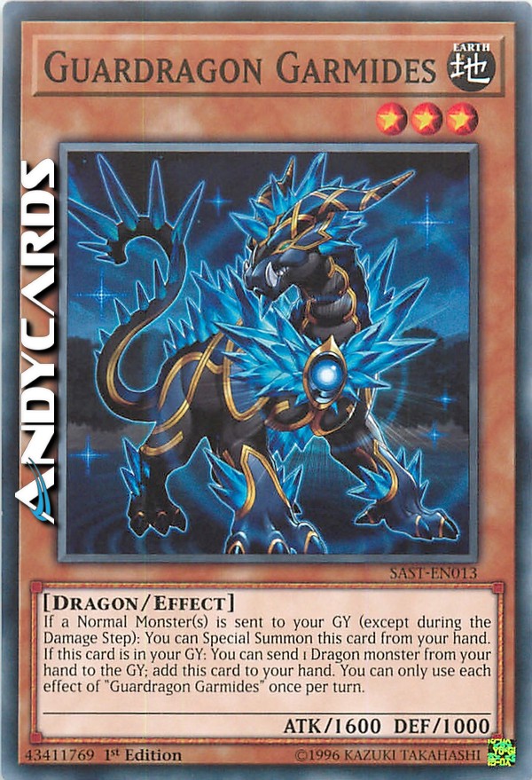 Se uno o più Mostri Normali vengono mandati al tuo Cimitero (eccetto durante il Damage Step): puoi Evocare Specialmente questa carta dalla tua mano. Se questa carta è nel tuo Cimitero: puoi mandare 1 mostro Drago dalla tua mano al Cimitero; aggiungi questa carta alla tua mano. Puoi utilizzare ogni effetto di "Guardrago Garmides" una sola volta per turno.