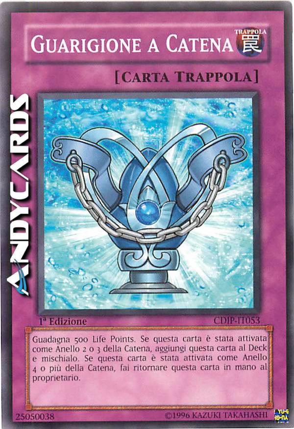 Guadagna 500 Life Points. Se questa carta è stata attivata come Anello 2 o 3 della Catena, aggiungi questa carta al Deck e mischialo. Se questa carta è stata attivata come Anello 4 o più della Catena, fai ritornare questa carta in mano al proprietario.