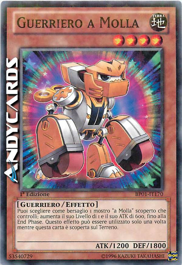 Puoi scegliere come bersaglio 1 mostro "a Molla" scoperto che controlli; aumenta il suo Livello di 1 e il suo ATK di 600, fino alla End Phase. Questo effetto può essere utilizzato solo una volta mentre questa carta è scoperta sul Terreno.