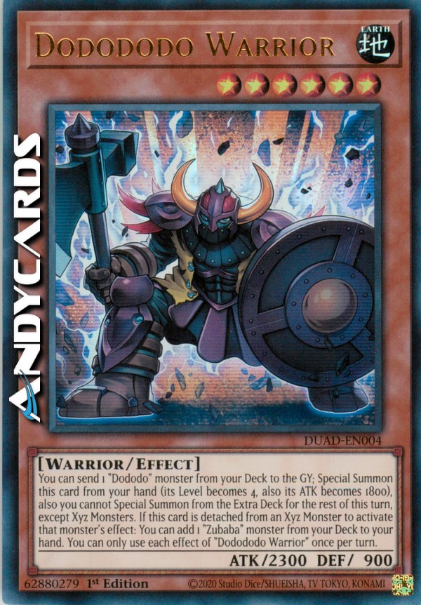 You can send 1 "Dododo" monster from your Deck to the GY; Special Summon this card from your hand (its Level becomes 4, also its ATK becomes 1800), also you cannot Special Summon from the Extra Deck for the rest of this turn, except Xyz Monsters. If this card is detached from an Xyz Monster to activate that monster's effect: You can add 1 "Zubaba" monster from your Deck to your hand. You can only use each effect of "Dodododo Warrior" once per turn.