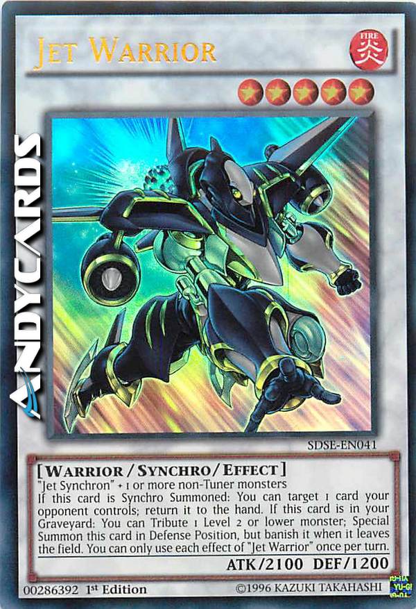 Se questa carta viene Synchro Evocata: puoi scegliere come bersaglio 1 carta controllata dal tuo avversario; falla ritornare nella mano. Se questa carta è nel tuo Cimitero: puoi offrire come Tributo 1 mostro di Livello 2 o inferiore; Evoca Specialmente questa carta in Posizione di Difesa, ma bandiscila quando lascia il Terreno. Puoi utilizzare ogni effetto di "Guerriero Jet" una sola volta per turno.