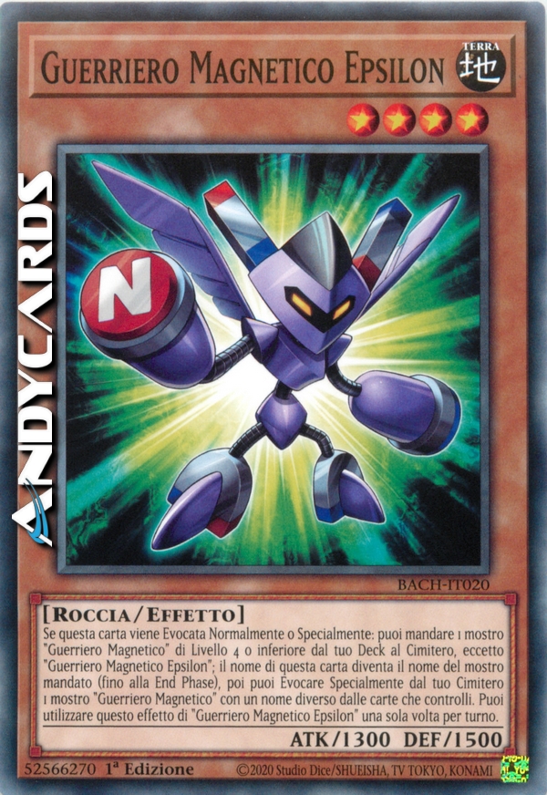 Se questa carta viene Evocata Normalmente o Specialmente: puoi mandare 1 mostro "Guerriero Magnetico" di Livello 4 o inferiore dal tuo Deck al Cimitero, eccetto "Guerriero Magnetico Epsilon"; il nome di questa carta diventa il nome del mostro mandato (fino alla End Phase), poi puoi Evocare Specialmente dal tuo Cimitero 1 mostro "Guerriero Magnetico" con un nome diverso dalle carte che controlli. Puoi utilizzare questo effetto di "Guerriero Magnetico Epsilon" una sola volta per turno.