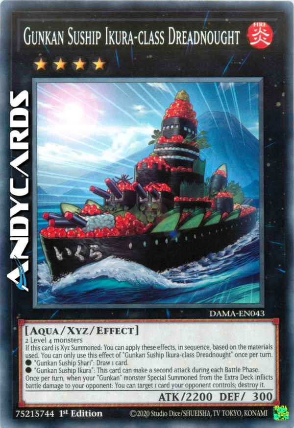 Una volta per turno, quando un tuo mostro "Gunkan" Evocato Specialmente dall'Extra Deck infligge danno da combattimento al tuo avversario: puoi scegliere come bersaglio 1 carta controllata dal tuo avversario; distruggila.