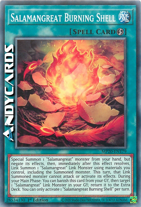 Evoca Specialmente 1 mostro "Salamagna" dalla tua mano, ma annulla i suoi effetti, poi, immediatamente dopo che questo effetto si è risolto, Evoca Link 1 Mostro Link "Salamagna" utilizzando materiali che controlli, compreso il mostro Evocato. In questo turno, quel mostro Evocato Link non può attaccare o attivare i suoi effetti. Durante la tua Main Phase: puoi bandire questa carta dal tuo Cimitero, poi scegliere come bersaglio 1 Mostro Link "Salamagna" nel tuo Cimitero; fallo ritornare nell'Extra Deck. Puoi attivare solo 1 "Guscio Bruciante Salamagna" per turno.