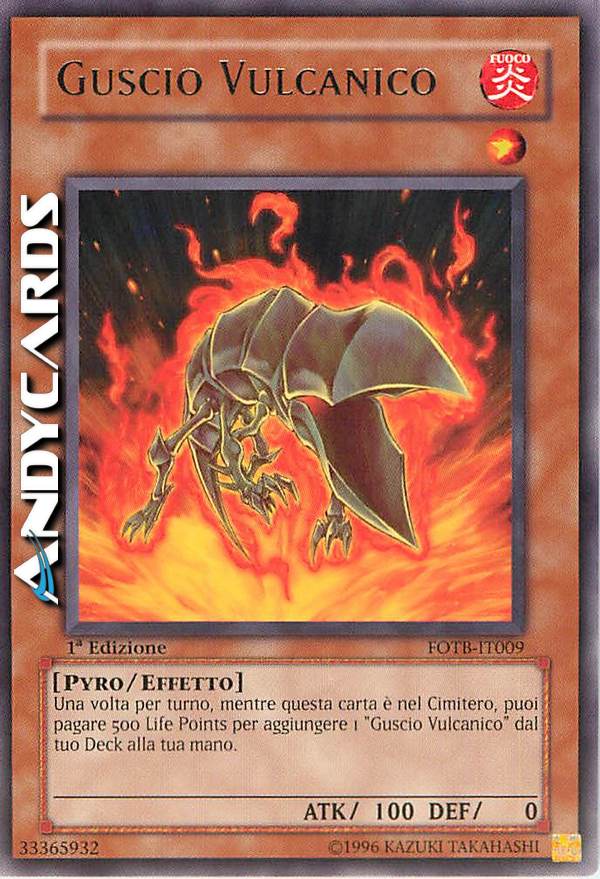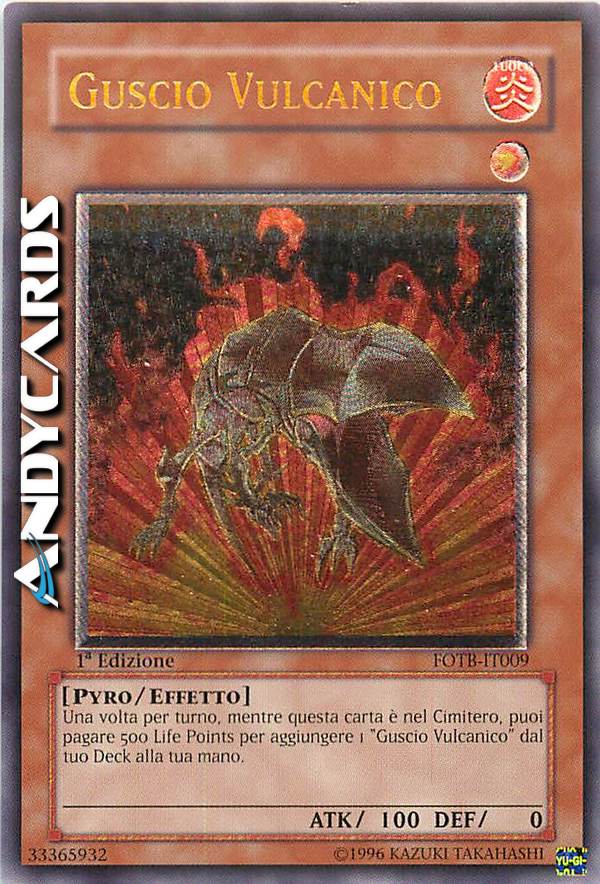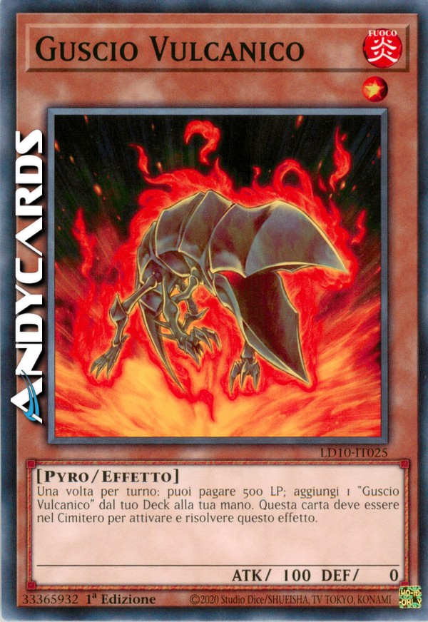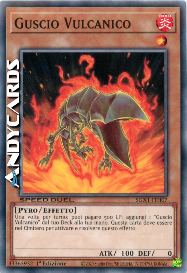 Una volta per turno, mentre questa carta è nel Cimitero, puoi pagare 500 Life Points per aggiungere 1 "Guscio Vulcanico" dal tuo Deck alla tua mano.