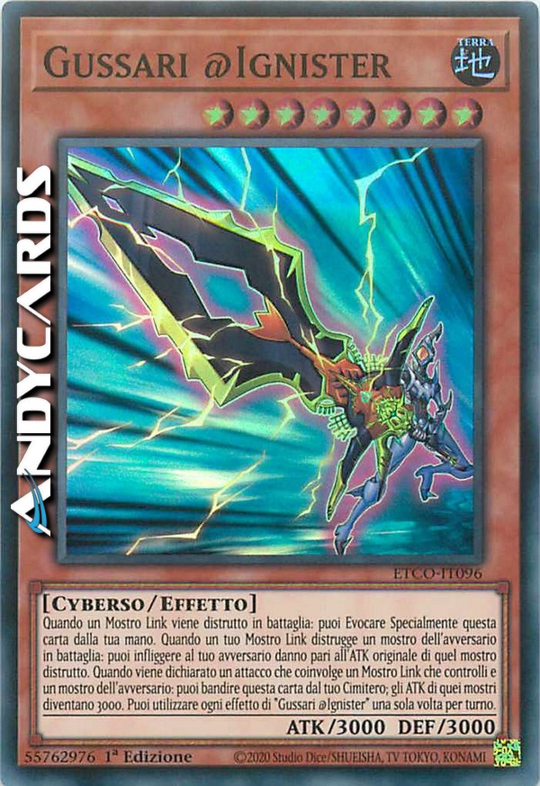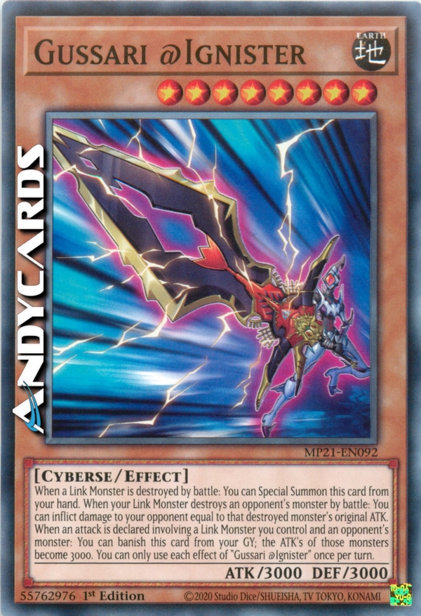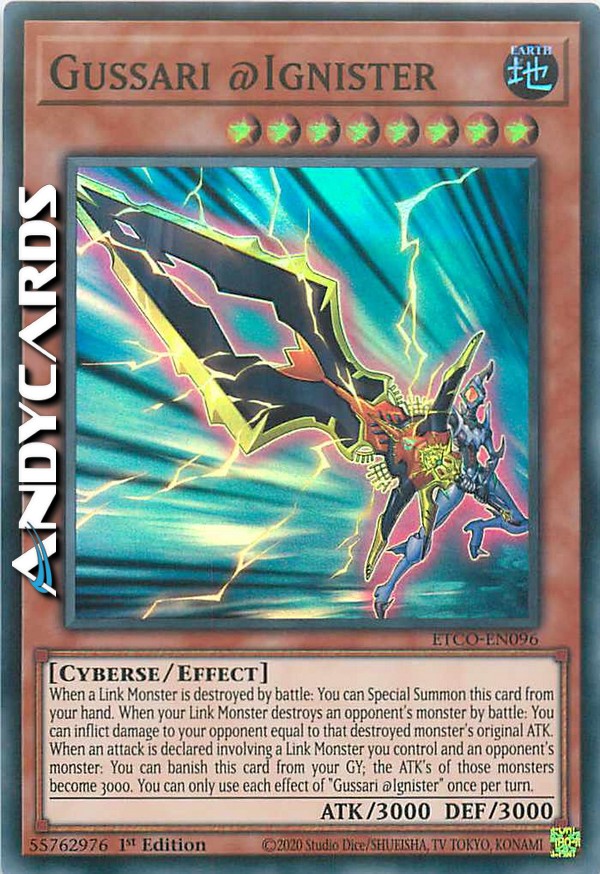 Quando un Mostro Link viene distrutto in battaglia: puoi Evocare Specialmente questa carta dalla tua mano. Quando un tuo Mostro Link distrugge un mostro dell'avversario in battaglia: puoi infliggere al tuo avversario danno pari all'ATK originale di quel mostro distrutto. Quando viene dichiarato un attacco che coinvolge un Mostro Link che controlli e un mostro dell'avversario: puoi bandire questa carta dal tuo Cimitero; gli ATK di quei mostri diventano 3000. Puoi utilizzare ogni effetto di "Gussari @Ignister" una sola volta per turno.
