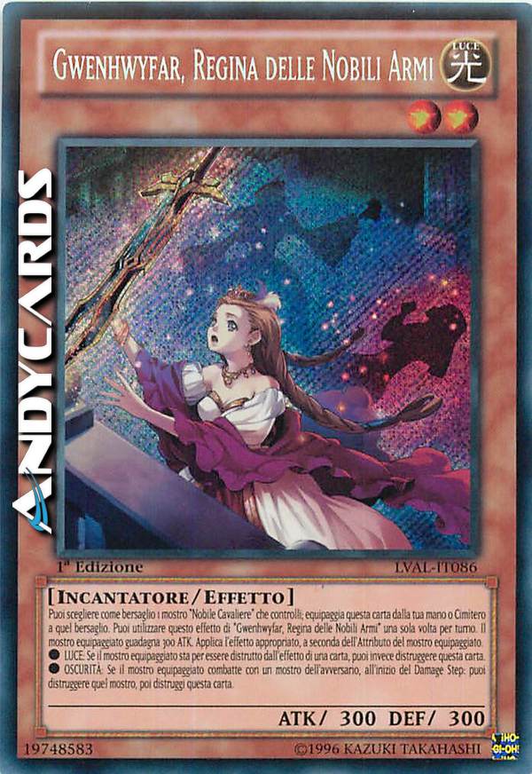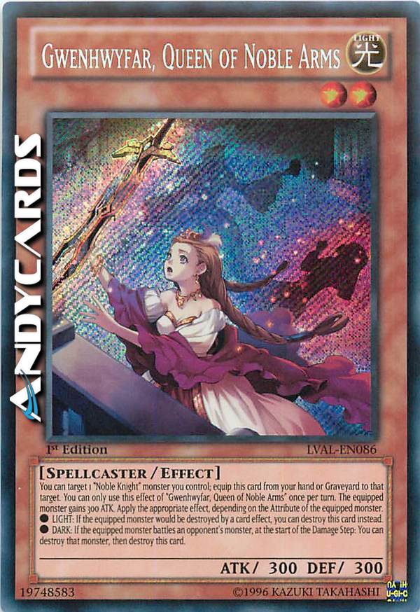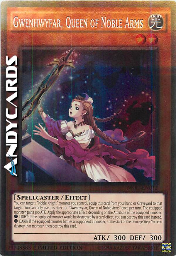 Puoi scegliere come bersaglio 1 mostro "Nobile Cavaliere" che controlli; equipaggia questa carta dalla tua mano o Cimitero a quel bersaglio. Puoi utilizzare questo effetto di "Gwenhwyfar, Regina delle Nobili Armi" una sola volta per turno. IL mostro equipaggiato guadagna 300 ATK. Applica l'effetto appropriato, a seconda dell'Attributo del mostro equipaggiato.