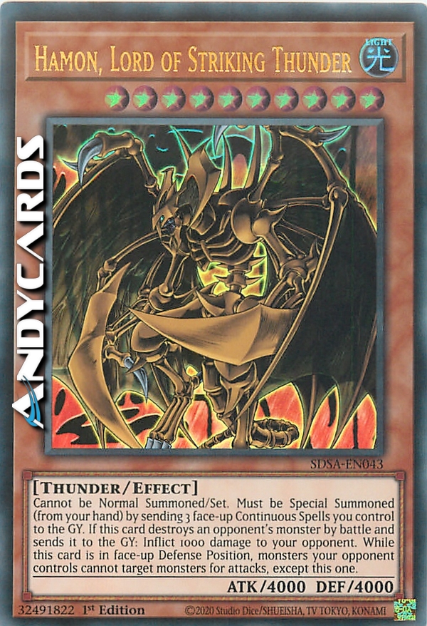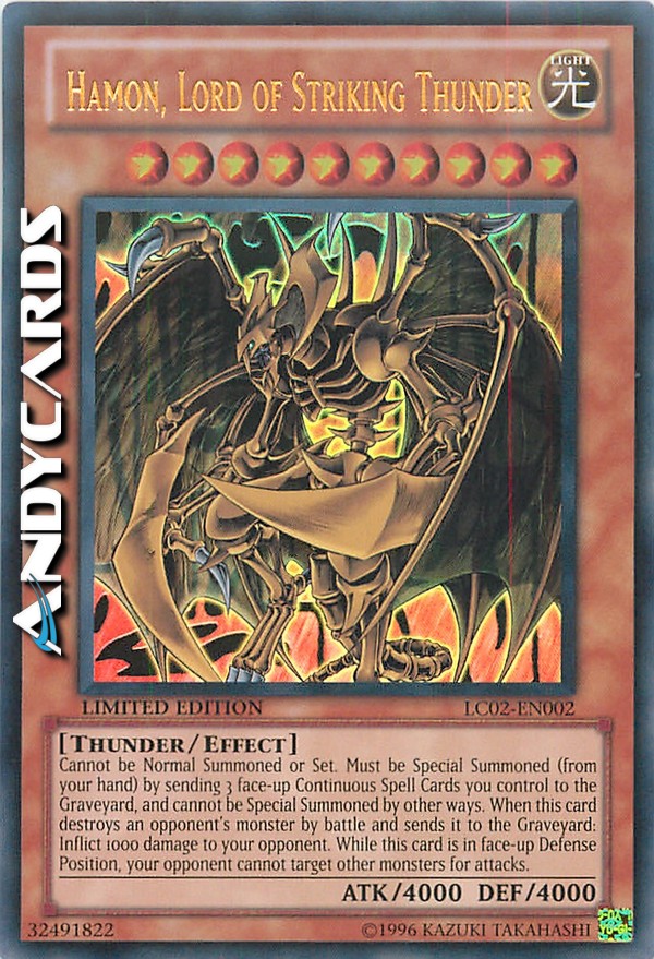 Questa carta non può essere Evocata tramite Evocazione Normale o Posizionata. Questa carta non può essere Evocata tramite Evocazione Speciale se non mandando 3 Carte Magia Continua scoperte dal tuo Terreno al Cimitero. Quando questa carta distrugge un mostro del tuo avversario in seguito ad una battaglia e lo manda al Cimitero, infliggi 1000 punti di danno ai Life Points del tuo avversario. Fino a quando questa carta è scoperta in Posizione di Difesa sul tuo Terreno, il tuo avversario non può scegliere un altro mostro come bersaglio di un attacco.