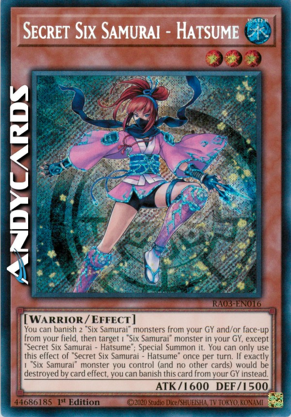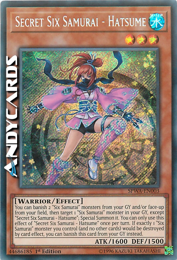 You can banish 2 "Six Samurai" monsters from your GY and/or face-up from your field, then target 1 "Six Samurai" monster in your GY, except "Secret Six Samurai - Hatsume"; Special Summon it. You can only use this effect of "Secret Six Samurai - Hatsume" once per turn. If exactly 1 "Six Samurai" monster you control (and no other cards) would be destroyed by card effect, you can banish this card from your GY instead.