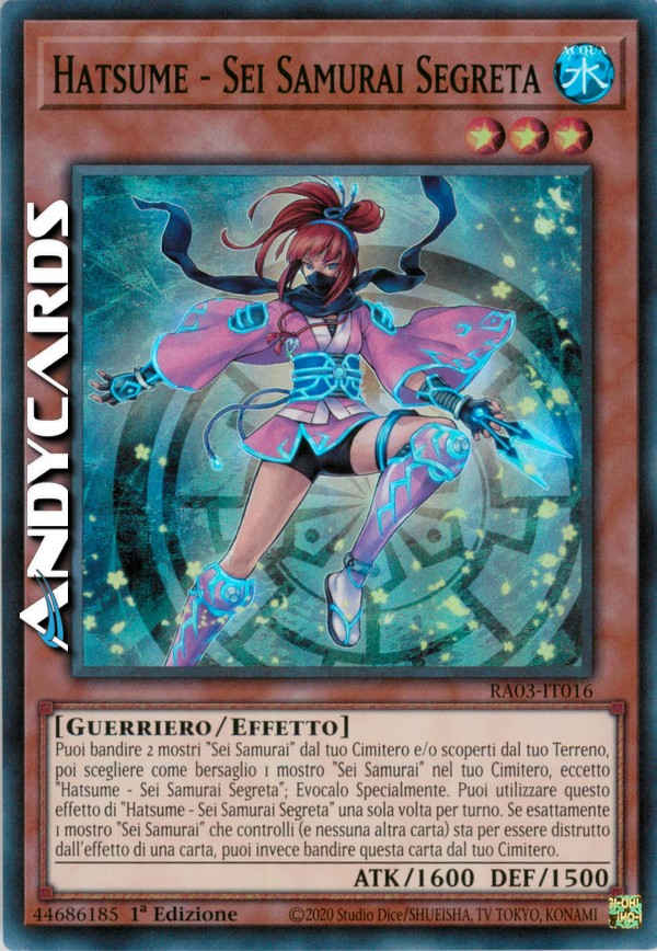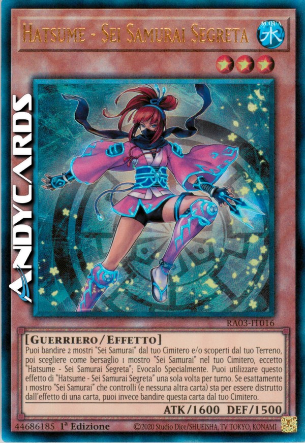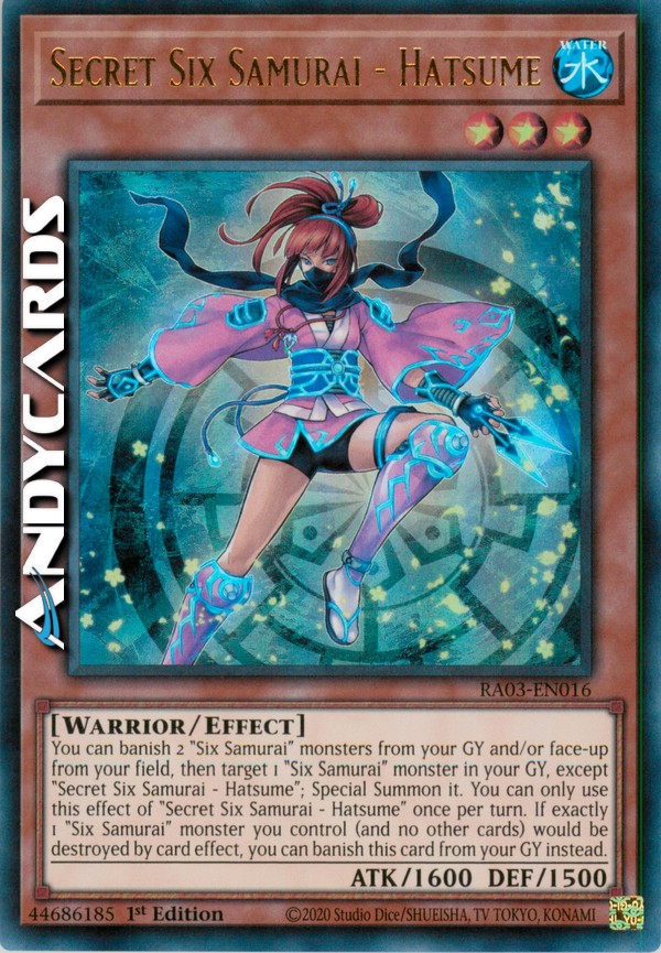 Puoi bandire 2 mostri "Sei Samurai" dal tuo Cimitero e/o scoperti dal tuo Terreno, poi scegliere come bersaglio 1 mostro "Sei Samurai" nel tuo Cimitero, eccetto "Hatsume - Sei Samurai Segreta"; Evocalo Specialmente. Puoi utilizzare questo effetto di "Hatsume - Sei Samurai Segreta" una sola volta per turno. Se esattamente 1 mostro "Sei Samurai" che controlli (e nessuna altra carta) sta per essere distrutto dall'effetto di una carta, puoi invece bandire questa carta dal tuo Cimitero.