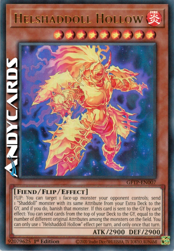 FLIP: You can target 1 face-up monster your opponent controls; send 1 "Shaddoll" monster with its same Attribute from your Extra Deck to the GY, and if you do, banish that monster. If this card is sent to the GY by card effect: You can send cards from the top of your Deck to the GY, equal to the number of different original Attributes among the monsters on the field. You can only use 1 "Helshaddoll Hollow" effect per turn, and only once that turn.