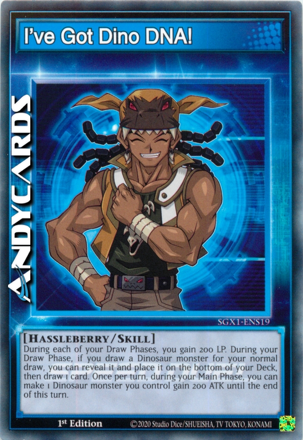 Durante ogni tua Draw Phase, guadagni 200 LP. Durante la tua Draw Phase, se peschi un mostro Dinosauro per la tua normale pescata, puoi rivelarlo e metterlo in fondo al tuo Deck, poi pescare 1 carta. Una volta per turno, durante la tua Main Phase, puoi far guadagnare 200 ATK a 1 mostro Dinosauro che controlli fino alla fine di questo turno.