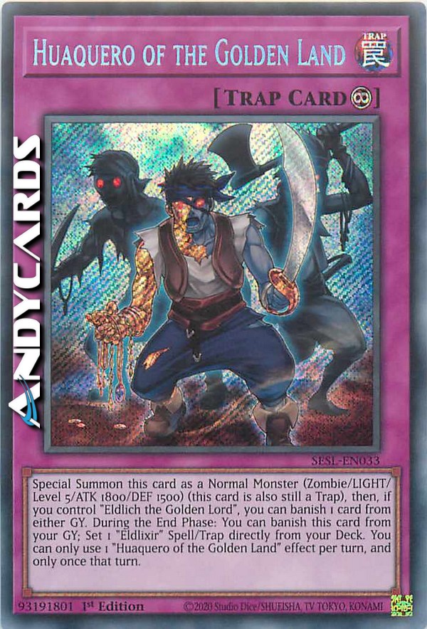 Special Summon this card as a Normal Monster (Zombie/LIGHT/Level 5/ATK 1800/DEF 1500) (this card is also still a Trap), then, if you control "Eldlich the Golden Lord", you can banish 1 card from either GY. During the End Phase: You can banish this card from your GY; Set 1 "Eldlixir" Spell/Trap directly from your Deck. You can only use 1 "Huaquero of the Golden Land" effect per turn, and only once that turn.