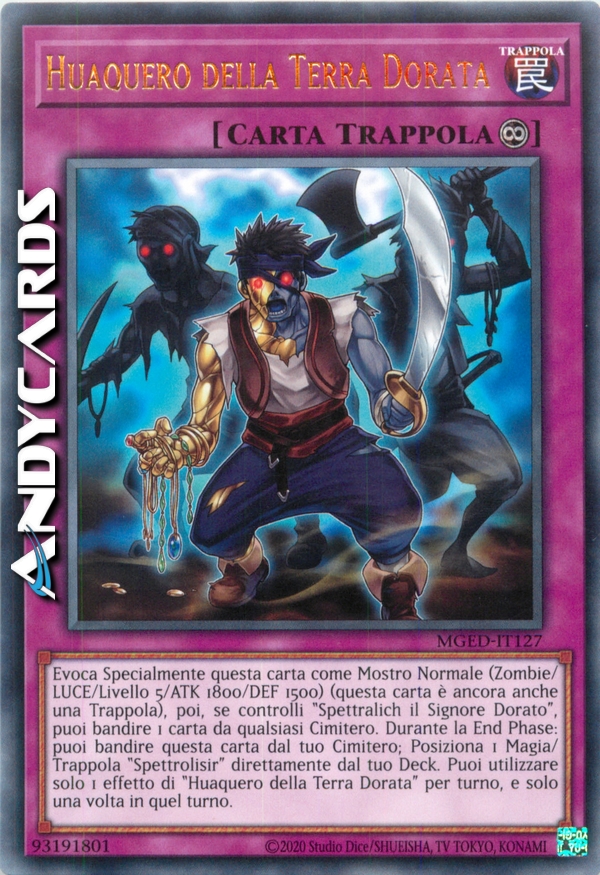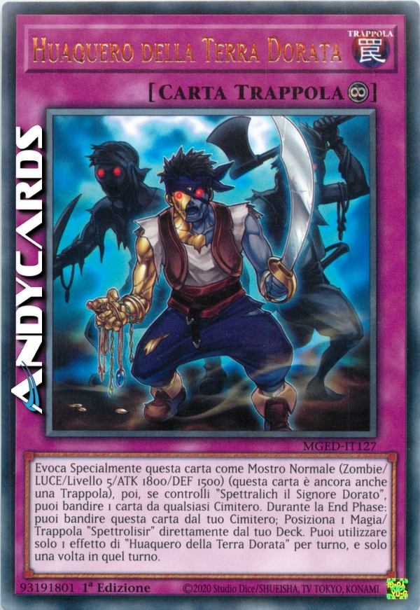Evoca Specialmente questa carta come Mostro Normale (Zombie/LUCE/Livello 5/ATK 1800/DEF 1500) (questa carta è ancora anche una Trappola), poi, se controlli "Spettralich il Signore Dorato", puoi bandire 1 carta da qualsiasi Cimitero. Durante la End Phase: puoi bandire questa carta dal tuo Cimitero; Posiziona 1 Magia/Trappola "Spettrolisir" direttamente dal tuo Deck. Puoi utilizzare solo 1 effetto di "Huaquero della Terra Dorata" per turno, e solo una volta in quel turno.