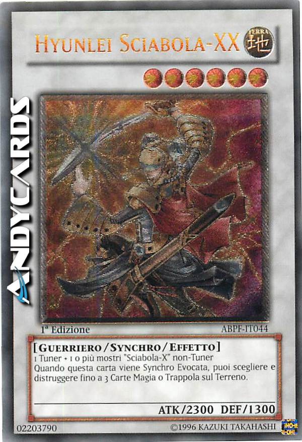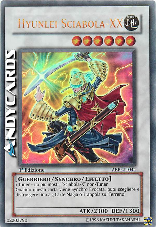 1 Tuner + 1 o più mostri "Sciabola-X" non-TunerQuando questa carta viene Synchro Evocata, puoi scegliere e distruggere fino a 3 Carte Magia o Trappola sul Terreno.