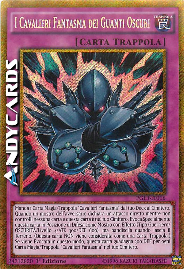 Manda 1 Carta Magia/Trappola "Cavalieri Fantasma" dal tuo Deck al Cimitero. Quando un mostro dell'avversario dichiara un attacco diretto mentre non controlli nessuna carta e questa carta è nel tuo Cimitero: Evoca Specialmente questa carta in Posizione di Difesa come Mostro con Effetto (Tipo Guerriero/OSCURITÀ/Livello 4/ATK 300/DEF 600), ma bandiscila quando lascia il Terreno. (Questa carta NON viene considerata come una Carta Trappola.) Se viene Evocata in questo modo, questa carta guadagna 300 DEF per ogni Carta Magia/Trappola "Cavalieri Fantasma" nel tuo Cimitero.