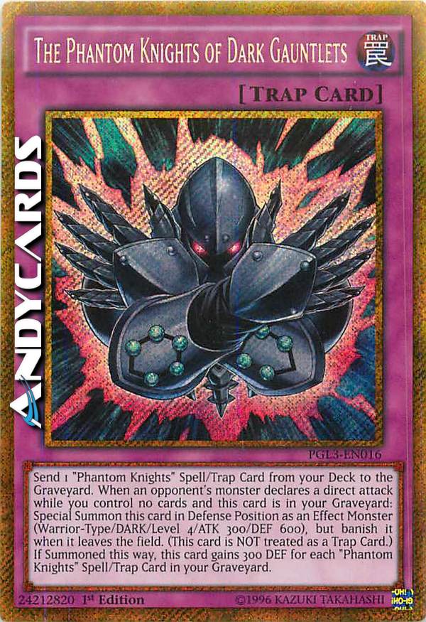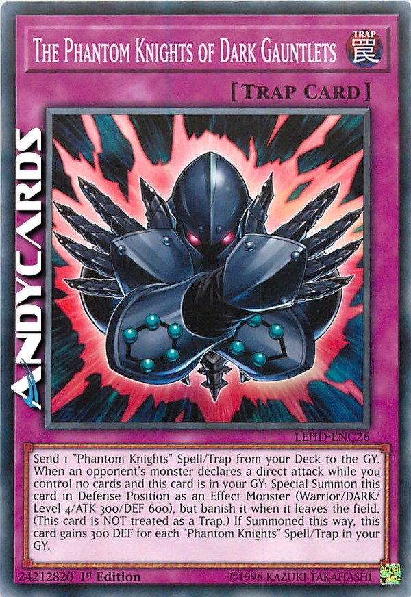 Send 1 "Phantom Knights" Spell/Trap Card from your Deck to the Graveyard. When an opponent's monster declares a direct attack while you control no cards and this card is in your Graveyard: Special Summon this card in Defense Position as an Effect Monster (Warrior-Type/DARK/Level 4/ATK 300/DEF 600), but banish it when it leaves the field. (This card is NOT treated as a Trap Card.) If Summoned this way, this card gains 300 DEF for each "Phantom Knights" Spell/Trap Card in your Graveyard.
