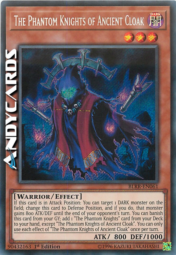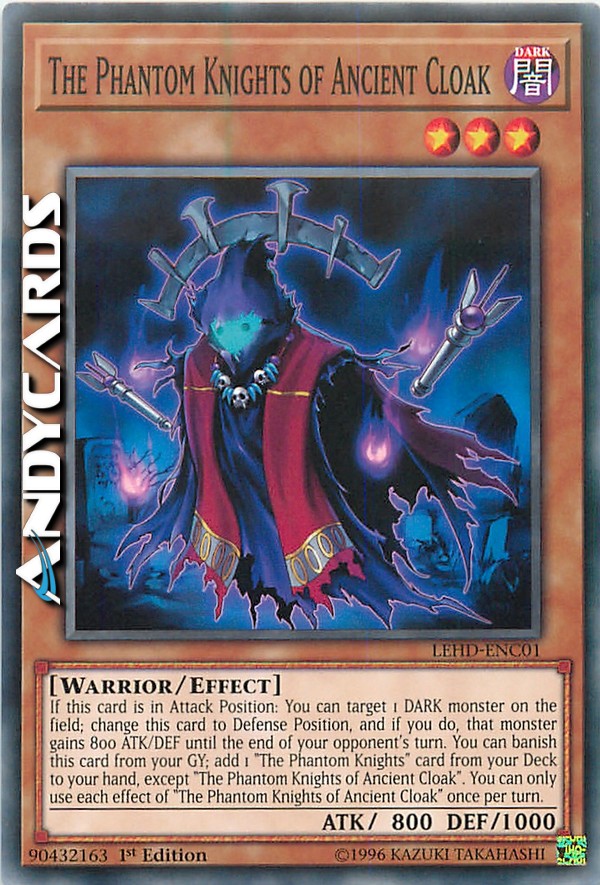 If this card is in Attack Position: You can target 1 DARK monster on the field; change this card to Defense Position, and if you do, that monster gains 800 ATK/DEF until the end of your opponent's turn. You can banish this card from your GY; add 1 "The Phantom Knights" card from your Deck to your hand, except "The Phantom Knights of Ancient Cloak". You can only use each effect of "The Phantom Knights of Ancient Cloak" once per turn.