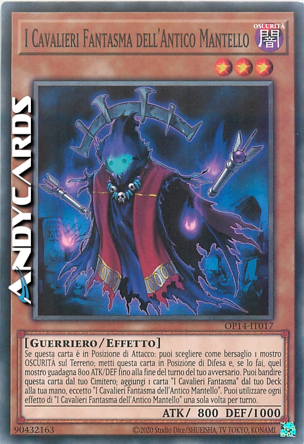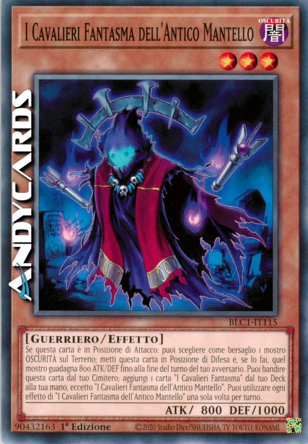 Se questa carta è in Posizione di Attacco: puoi scegliere come bersaglio 1 mostro OSCURITÀ sul Terreno; metti questa carta in Posizione di Difesa e, se lo fai, quel mostro guadagna 800 ATK/DEF fino alla fine del turno del tuo avversario. Puoi bandire questa carta dal tuo Cimitero; aggiungi 1 carta "I Cavalieri Fantasma" dal tuo Deck alla tua mano, eccetto "I Cavalieri Fantasma dell'Antico Mantello". Puoi utilizzare ogni effetto di "I Cavalieri Fantasma dell'Antico Mantello" una sola volta per turno.
