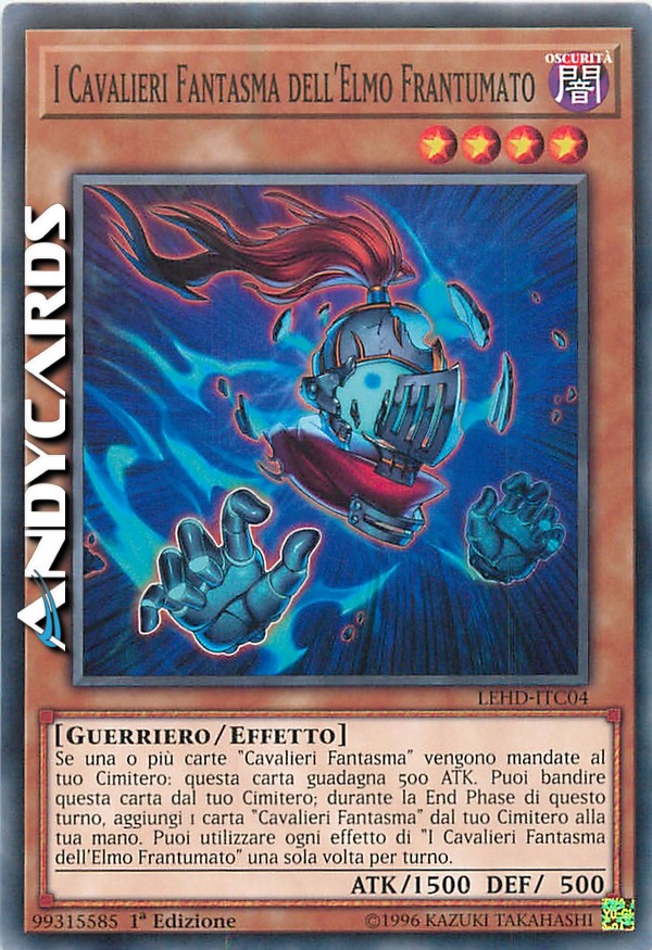Se una o più carte "Cavalieri Fantasma" vengono mandate al tuo Cimitero: questa carta guadagna 500 ATK. Puoi bandire questa carta dal tuo Cimitero; durante la End Phase di questo turno, aggiungi 1 carta "Cavalieri Fantasma" dal tuo Cimitero alla tua mano. Puoi utilizzare ogni effetto di "I Cavalieri Fantasma dell'Elmo Frantumato" una sola volta per turno.