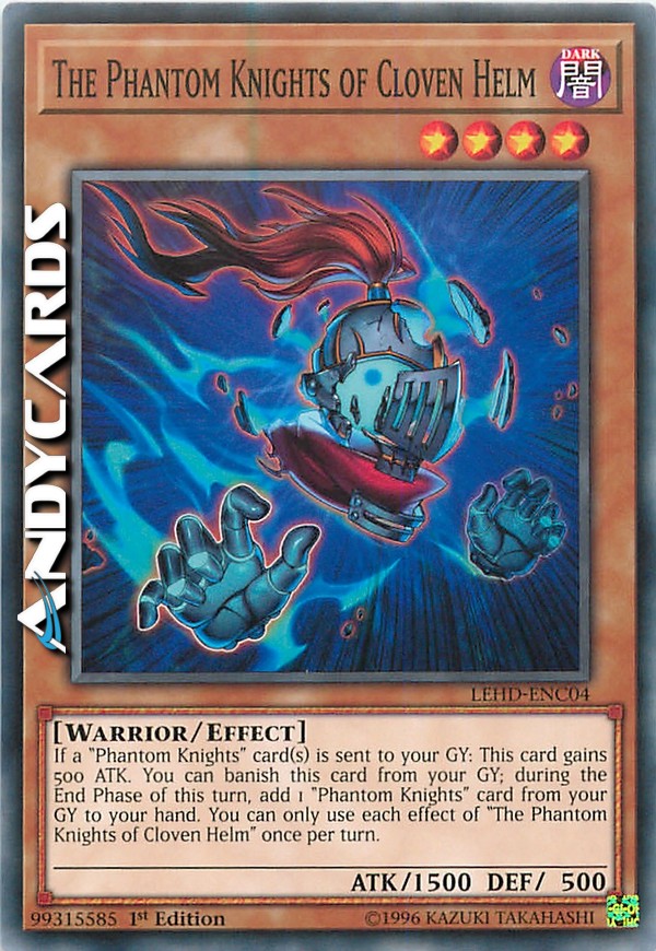 If a "Phantom Knights" card(s) is sent to your Graveyard: This card gains 500 ATK. You can banish this card from your Graveyard; during the End Phase of this turn, add 1 "Phantom Knights" card from your Graveyard to your hand. You can only use each effect of "The Phantom Knights of Cloven Helm" once per turn.