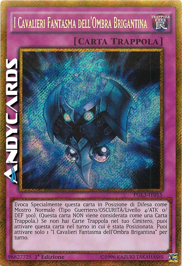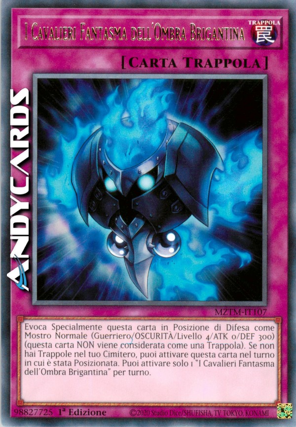 Evoca Specialmente questa carta in Posizione di Difesa come Mostro Normale (Guerriero/OSCURITÀ/Livello 4/ATK 0/DEF 300). (Questa carta NON viene considerata come una Trappola.) Se non hai Trappole nel tuo Cimitero, puoi attivare questa carta nel turno in cui è stata Posizionata. Puoi attivare solo 1 "I Cavalieri Fantasma dell'Ombra Brigantina" per turno.